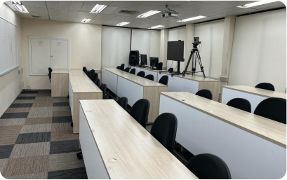 Equipado com tecnologia de projeção, lousa, iluminação modular por blocos, ideal para
